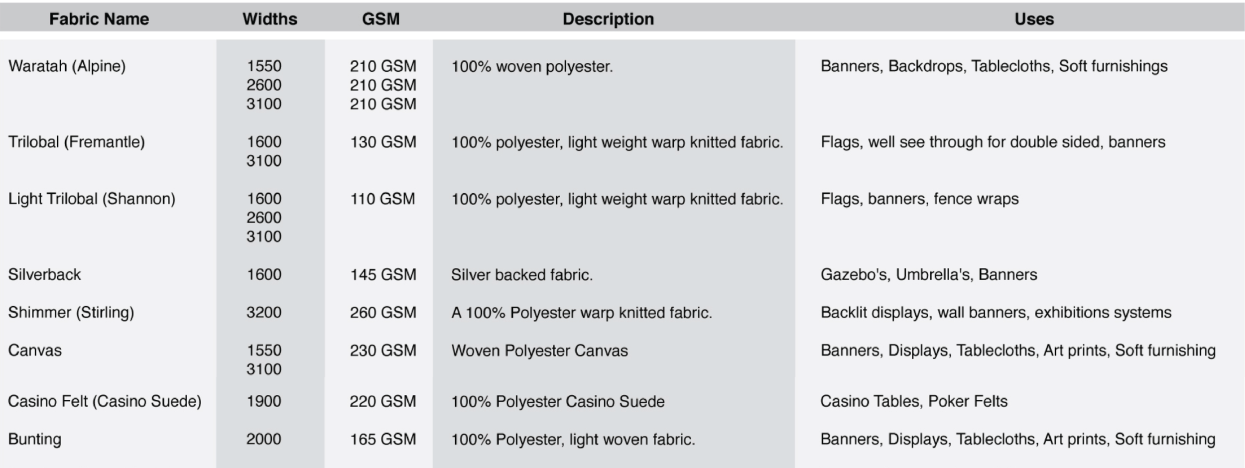 At Sublitech, we supply fabric for all custom jobs such as banners, flags, back drops and some upholstery. Below is a list of these fabrics and their uses: